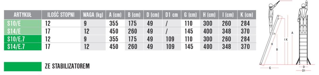 Parametry techniczne drabiny pojedynczej S14/E:
